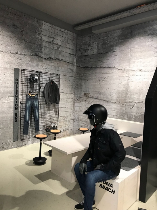 Die aktuellsten Kollektionen im Bereich Motorradbekleidung und -zubehör werden in Müllheim ausgestellt. Schwarze Wände und robuste Betonelemente sorgen dabei für den passenden Flair.